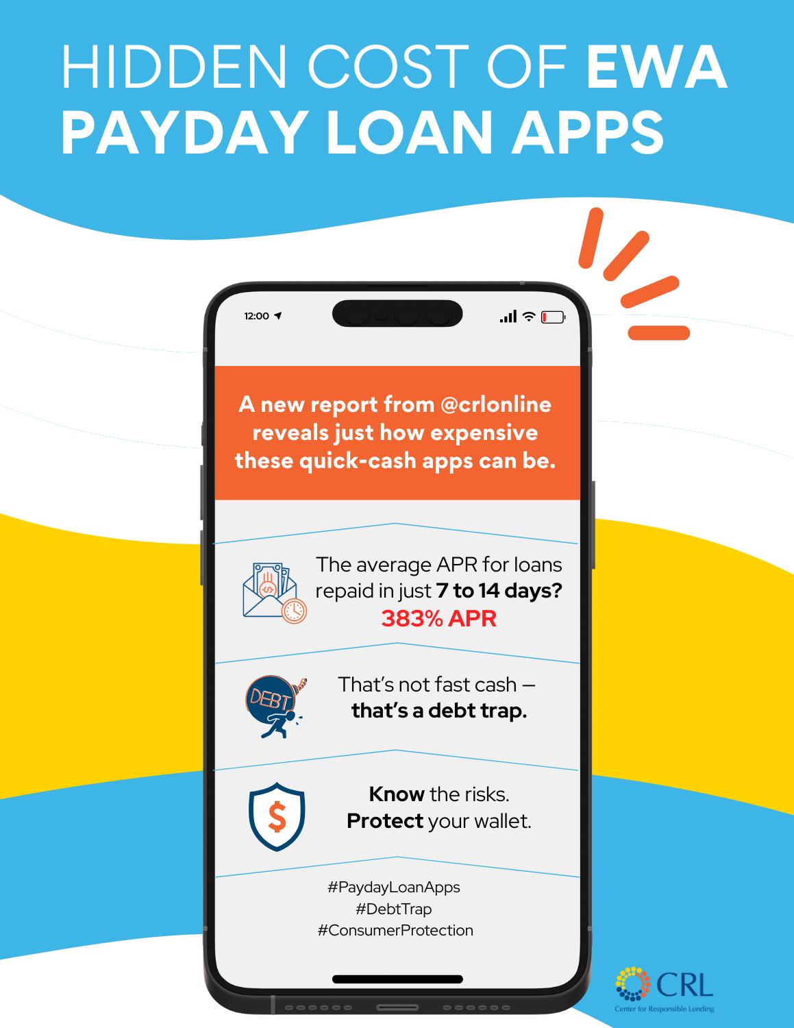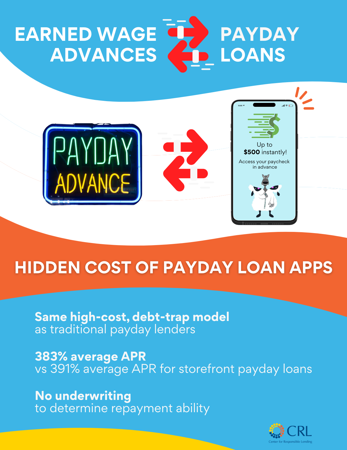 Payday loan apps offer small, short-term loans that are typically repaid on the consumers’ next payday. These products are sometimes called Earned Wage Advance, Early Wage Access, or EWA but few merit this name. Research by CRL and others has demonstrated using these apps leave many consumers worse off - paying high fees for small loans, increasing their risk of overdraft, and having to reborrow paycheck after paycheck. Regulators should enforce credit laws to increase transparency and to protect consumers' paychecks from being eroded by fees and tips.