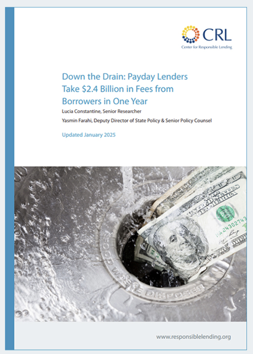 Payday loans are small loans, typically less than $500, with triple-digit interest rates—nearly 400% Annual Percentage Rate (APR) on average—that are usually due on the borrower’s next payday. These loans are repaid by a personal check held for deposit or, more commonly, electronic access to a bank account. Lenders market payday loans as quick cash to cover a financial emergency, but research demonstrates they often lead to a cycle of debt that is nearly impossible to escape. Due to the unaffordable and predatory nature of these loans, most borrowers end up reborrowing multiple times and paying more in fees than they originally received in credit.